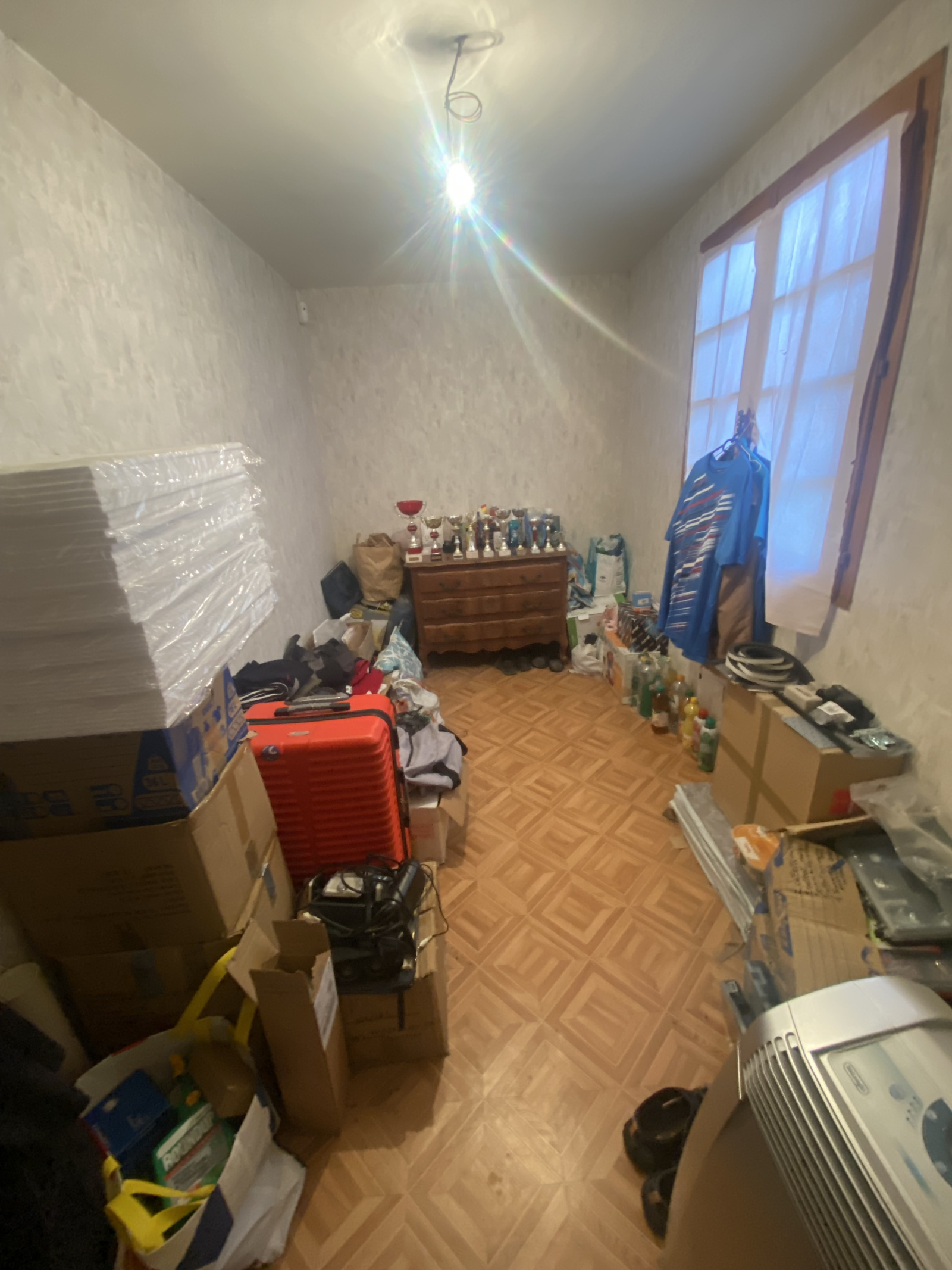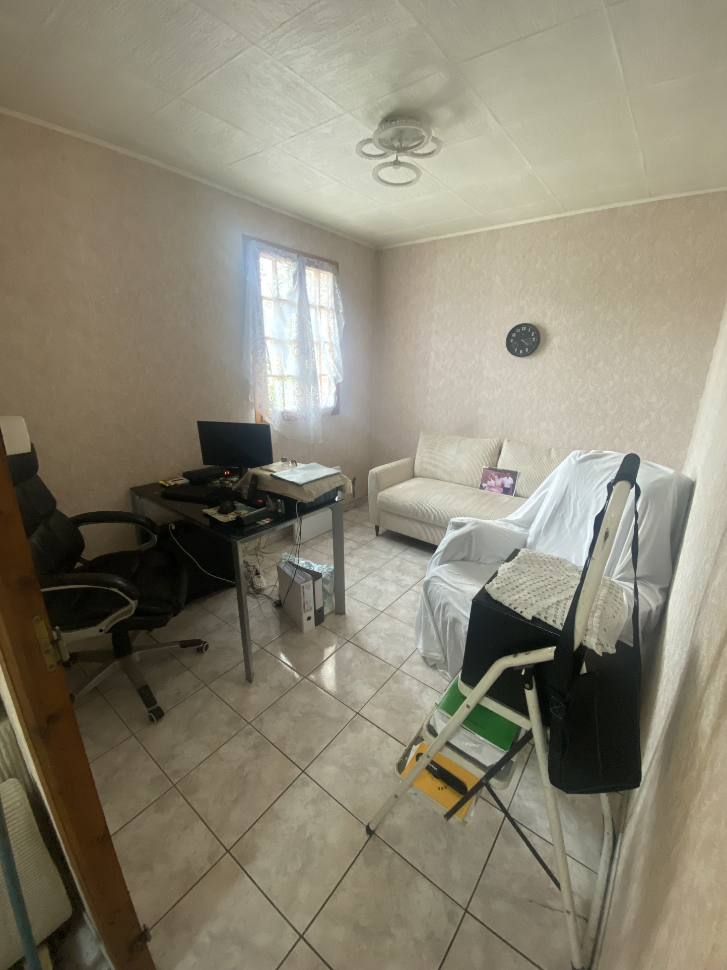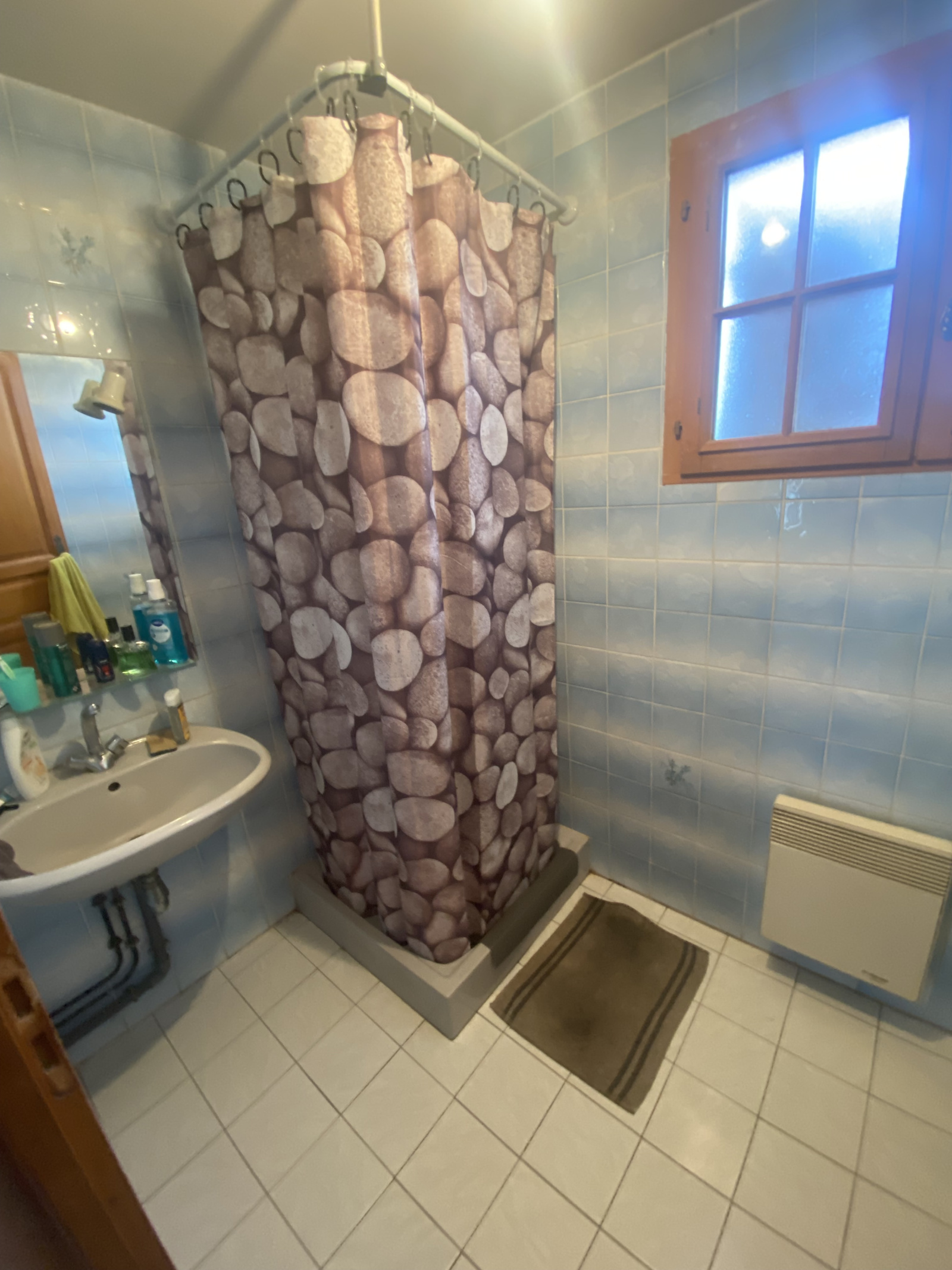 Un demi-niveau (4 marches) dessert un palier avec WC séparé, une salle d’eau et deux chambres de 9 m².