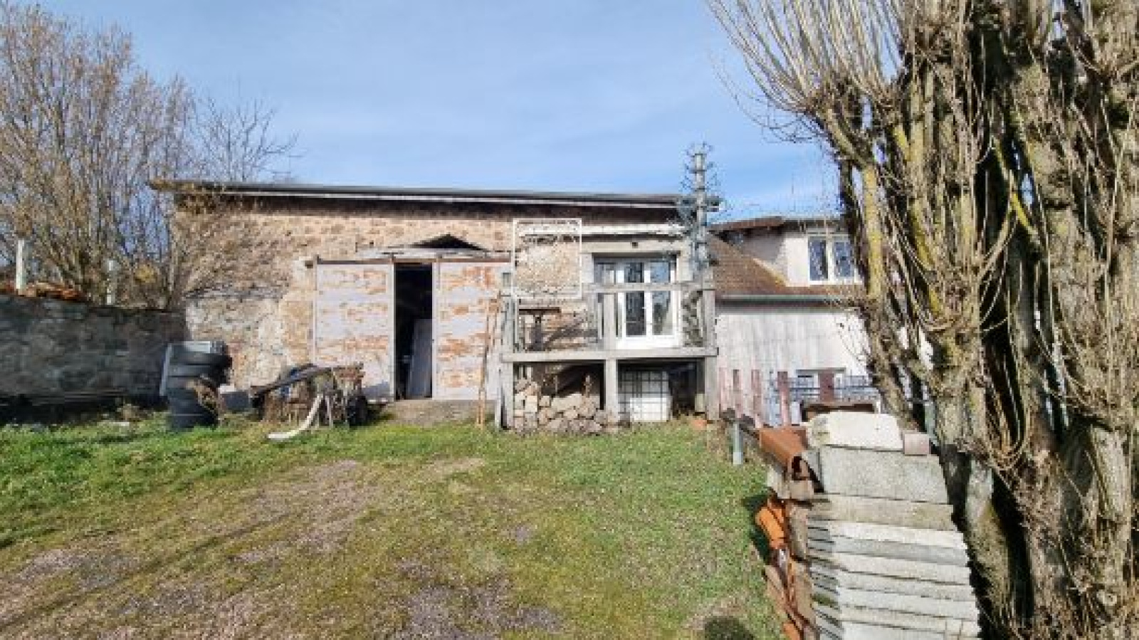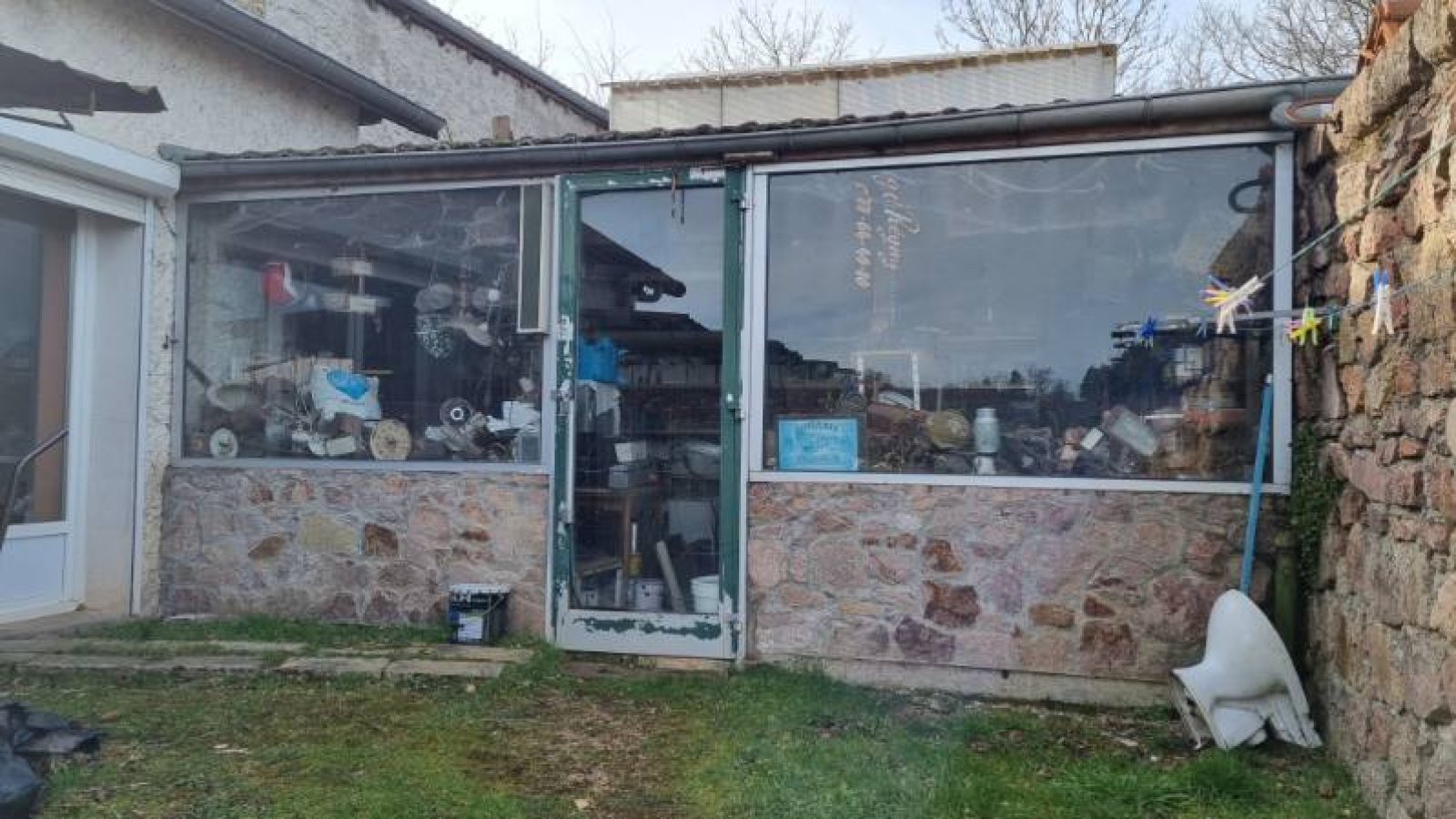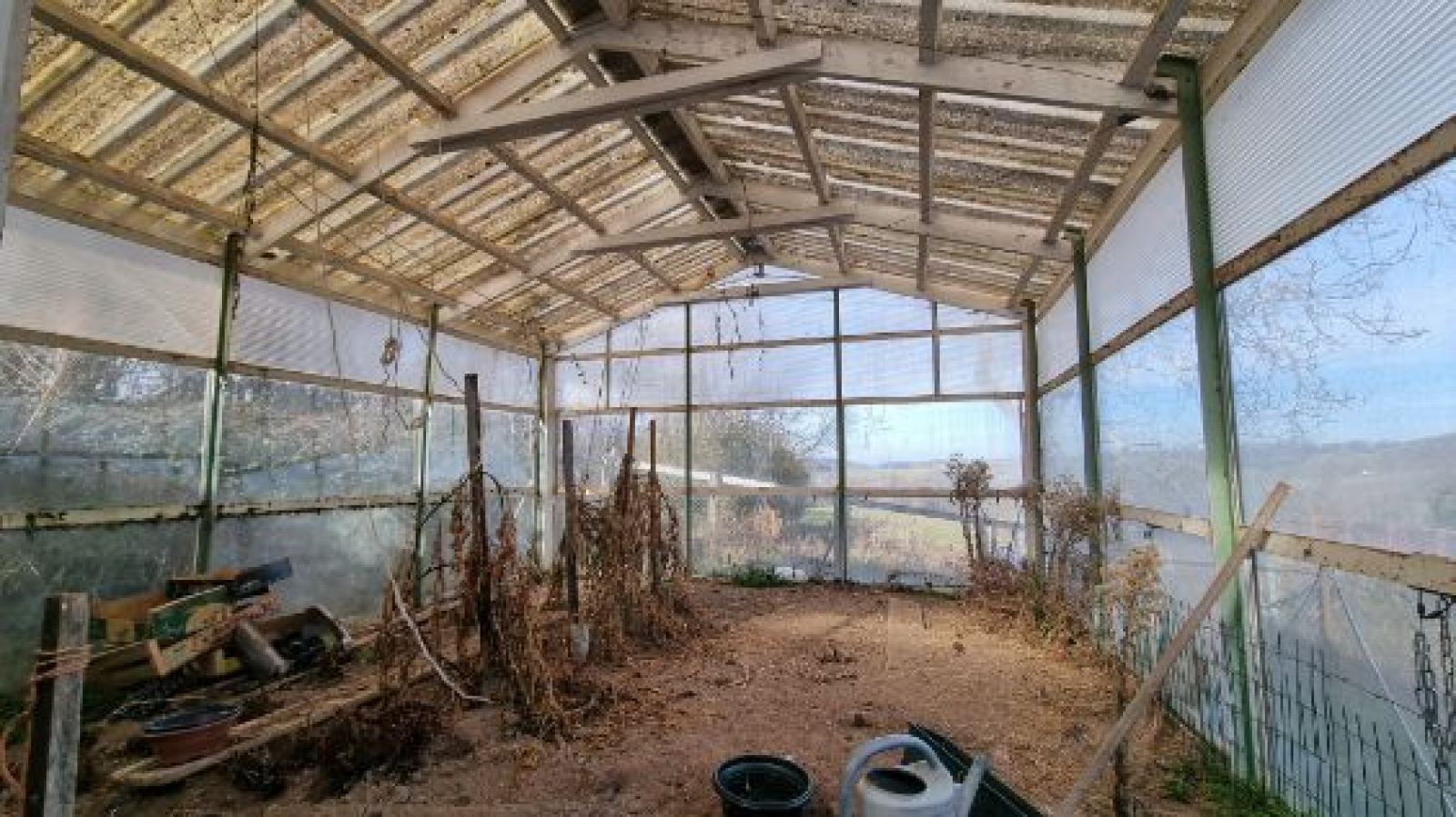 Terrain avec serre, poulailler, et un grand atelier avec cave.