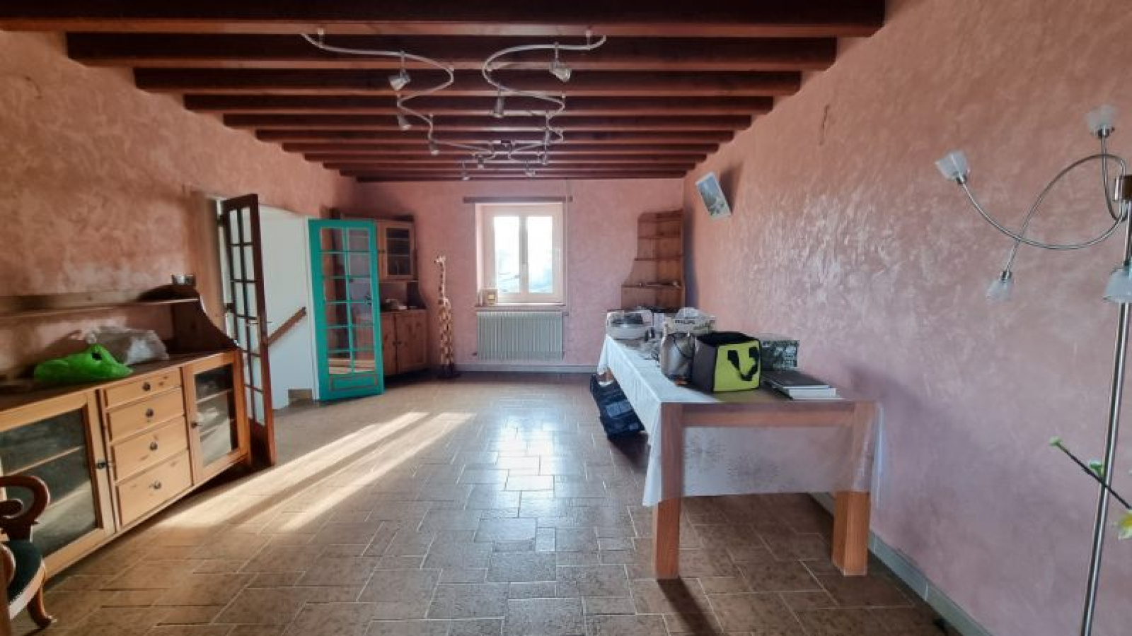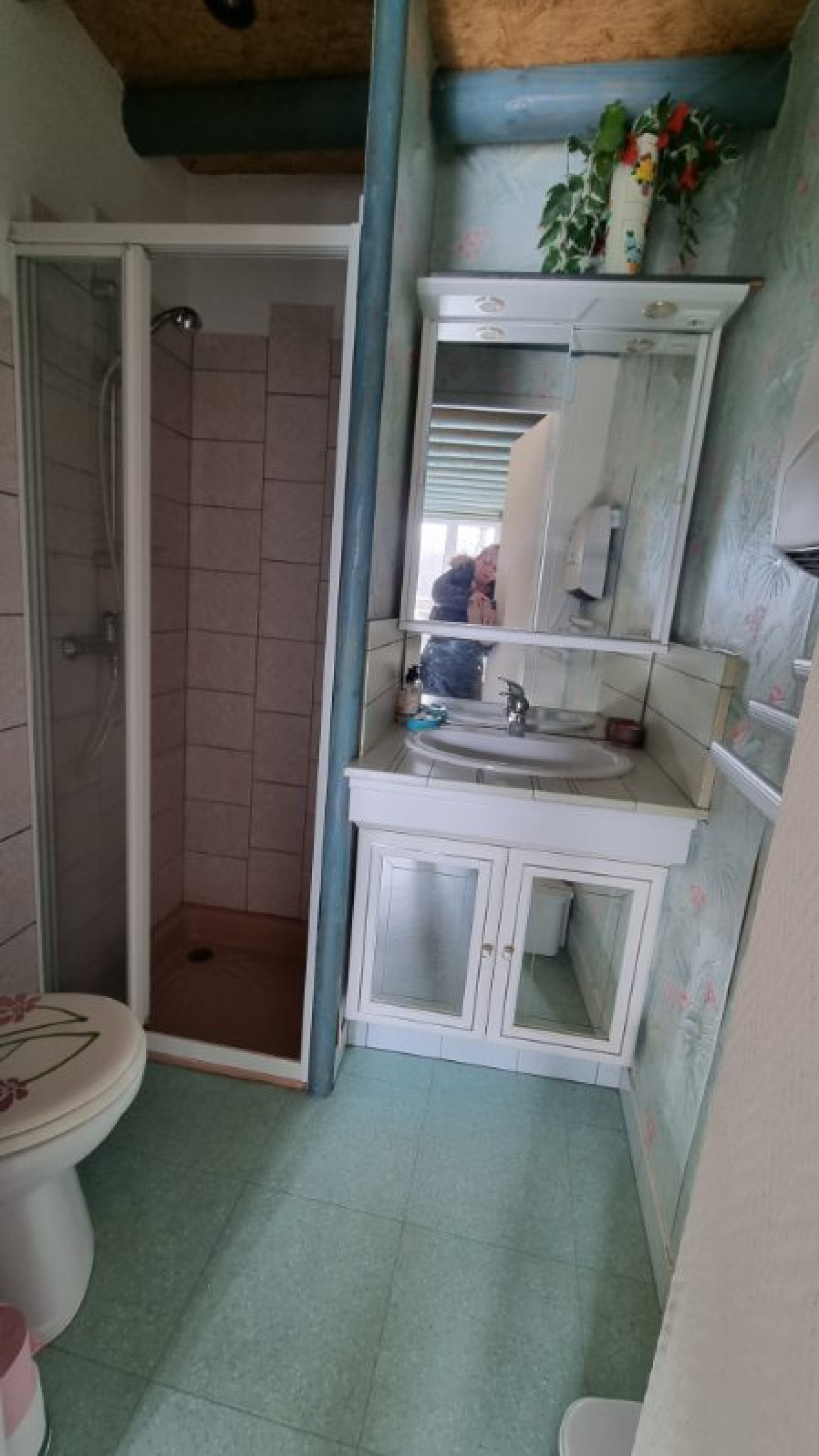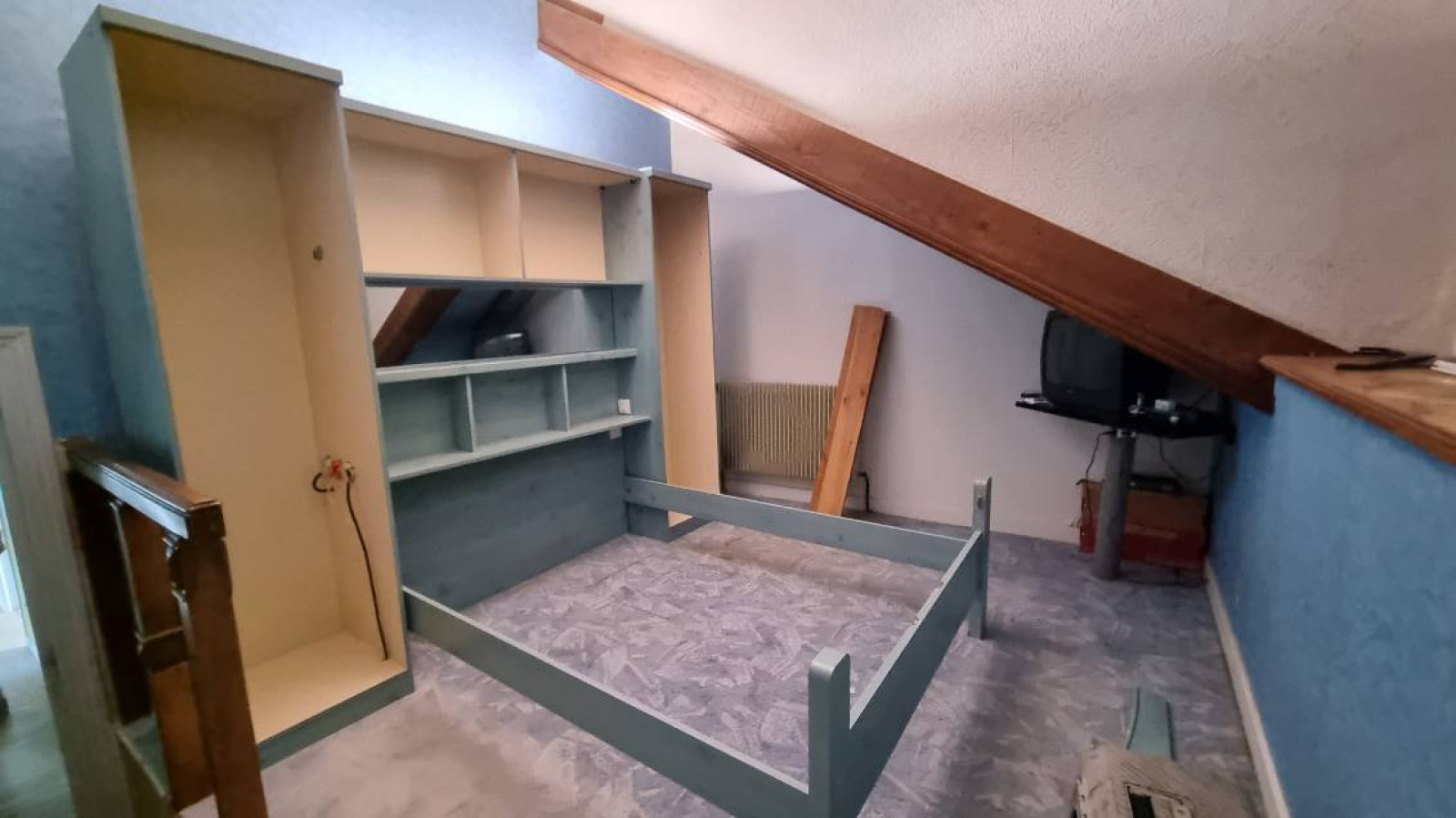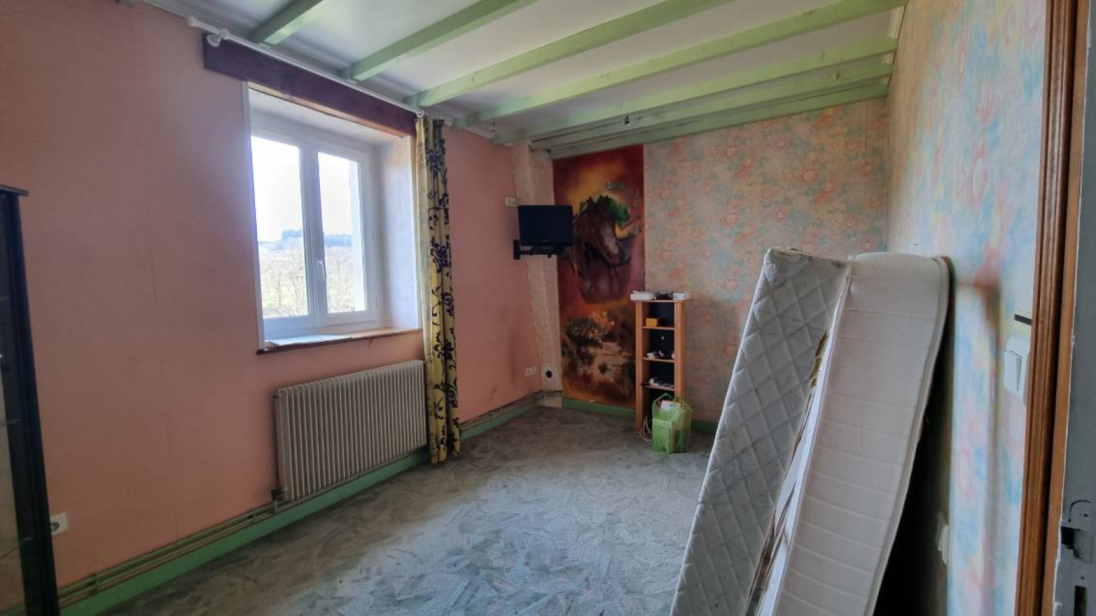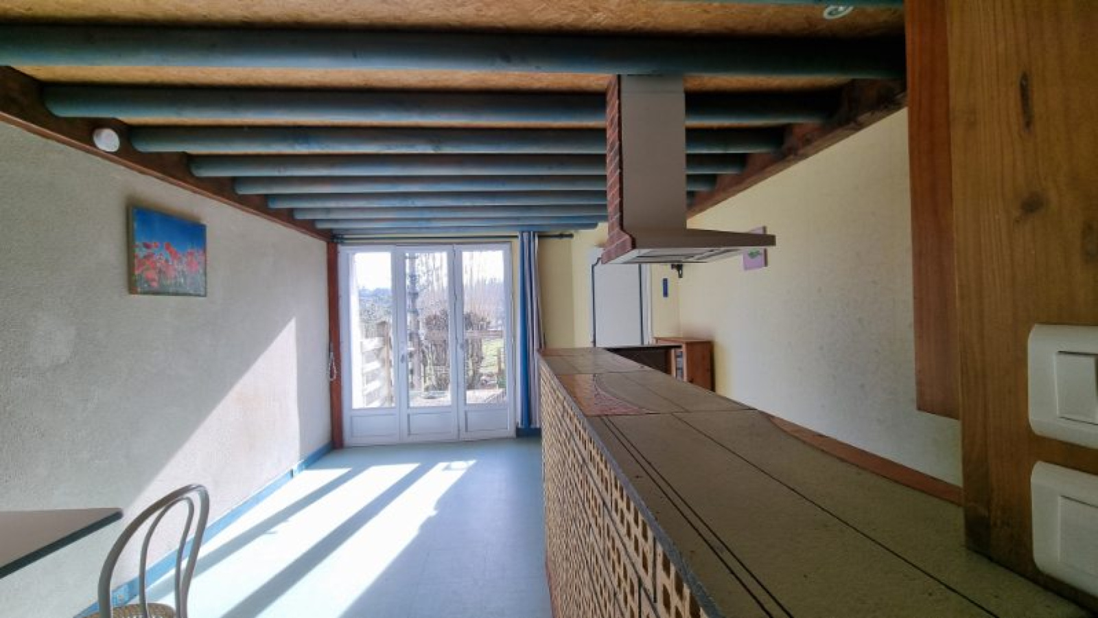 A l'étage: une grande mezzanine de 21m², une première chambre de 12m², une salle de bains avec WC de 11m² (à rénover) et d'une seconde chambre de 13m².